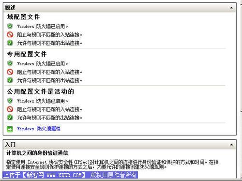 默认情况下,当你第一次进入Windows高级安全防火墙管理控制台的时候,你将看到Windows高级安全防火墙默认开启,并且阻挡不匹配入站规则的入站连接。此外,这个新的出站防火墙默认被关闭。
