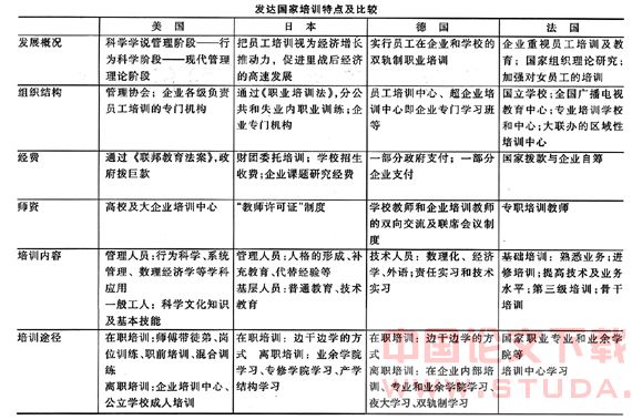 在这里,我们通过对美国、日本、德国、法国四个国家在培训的发展概况、组织结构、培训经费、培训师资、培训内容以及培训实践六个维度来分别阐述和比较他们的不同特点。