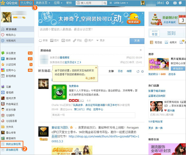QQ空间个人中心“管理应用”功能已优化,以下是隐藏的操作方法: